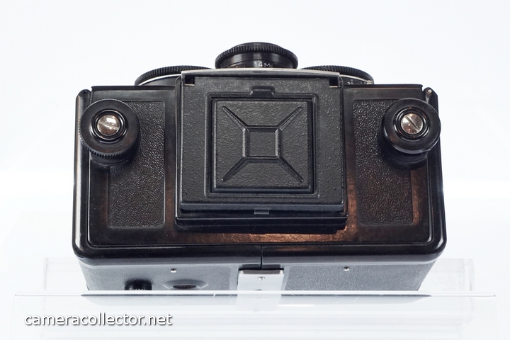 • The top has two knobs, the turning one on the right is a winder, and the second is a spring-loaded pull-out to hold the feed roll in place. In the middle is a fold-in, large viewer, taken straight from the Lubitel. The wings are punched steel, well-made and finished, operating smoothly. The view is large and clear.