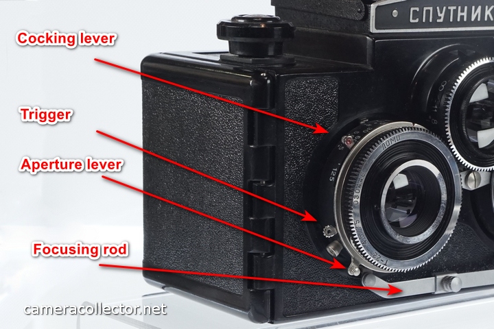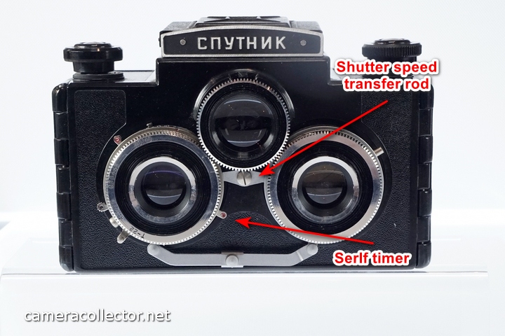 • The left lens carries the settings. Closest to the body is the aperture dial, which is controlled by a bar that connects the two lenses under the housing. In front of it is the shutter speed dial, controlled by a tab under the left lens. The left shutter commands the right one, where a second bar in between the lenses flicks the right shutter to sync it with the left.