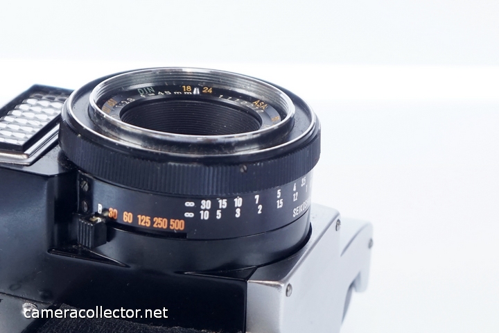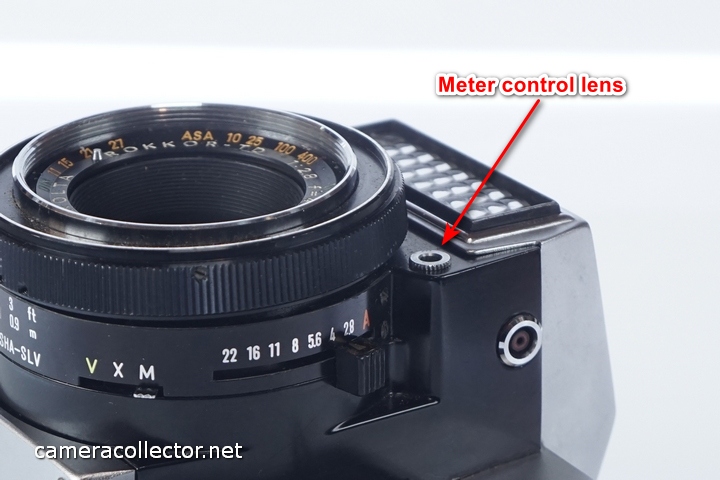 - Where the prominent feature on most cameras is the lens assembly, here it is the mighty light meter lens, mounted proud above the prime lens.