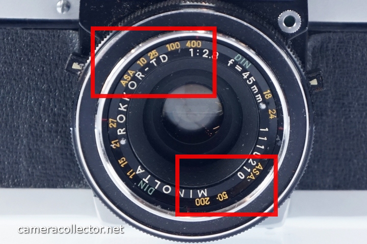 - Film speed setting is located at the front of the lens barrel, around the prime lens. Hunt for two nearly invisible pins to select the chosen value, which may require a brave fingernail. The values in ASA and DIN are scattered around the lens to maintain a readable font size.