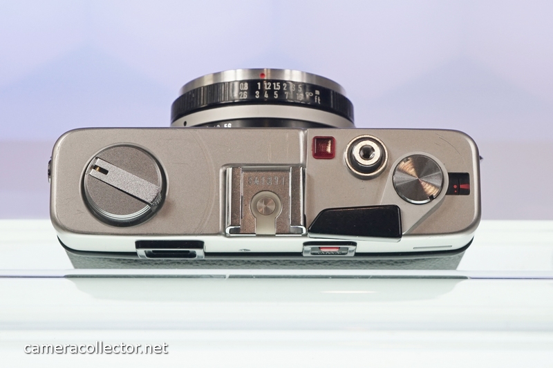 - The top features a miniature winding lever that pulls from the top, as it sits flush with the body. Travel is shorter than earlier models. A red lens lights up with a press of the battery check button. Hot accessory shoe and pull-out folding rewind lever that doubles as a back release. The shoe will detect a mounted flash gun and put the camera in flash mode.
