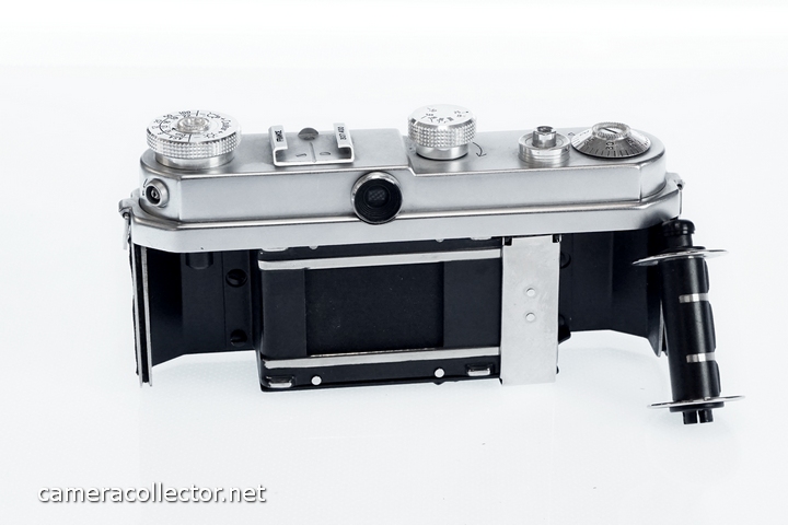 - The top, from left, has the frame counter, manual reset, the trigger nearby, the speed selector that doubles as the shutter cocking dial, and the rewind knob with a film type memo on it. A personal note from a tool maker’s view, the machining is flawless, where the speed selector is perfectly machined to fit around its base. I have never seen such precision work on a camera before.