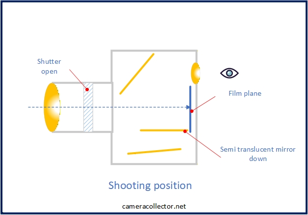 In the Focaflex, there is no prism, but a set of mirrors. Upon winding, a semi-translucent mirror flips up against the lens, think Canon Pelix. The beam is reflected through the semi-translucent surface, hitting it at an angle, then passes through to the top-mounted mirror, which deflects it to the user’s eye. With the trigger pressed, the mirror drops down, directing the beam to the focal plane. The action is similar to a common SLR mirror: it flips down, out of the way for shooting, rather than flipping up on the rest. In the Focaflex, the mirror stays down until the next shutter cocking; there is no auto-return mode as in later-generation SLRs. There are simulations in the OPL documents that may be unclear; please see below a simplified sketch that explains the above.