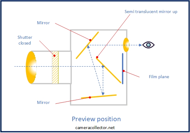 The main difference between the Focaflex and the rest of the SLR models is in the optics. Common to other models was the use of a pentaprism to deflect the beam from the mirror to the user’s eye. Alternatively, the camera could have a waist-level viewer, eliminating the need for a prism. Still, the viewer and the pentaprism hump typically indicated the SLR camera type. In a pentaprism camera, the mirror is down in the preview position. To shoot, the mirror swings up so the beam is directed to the focal plane.